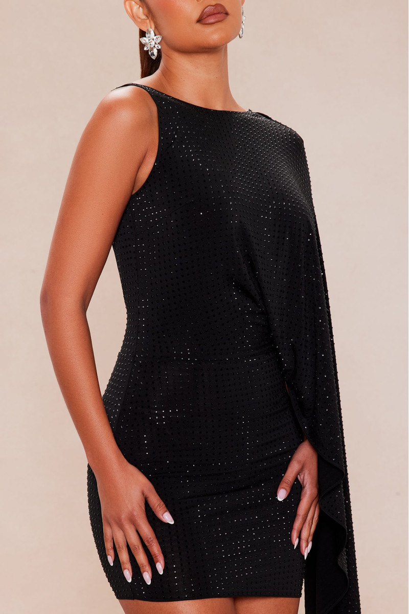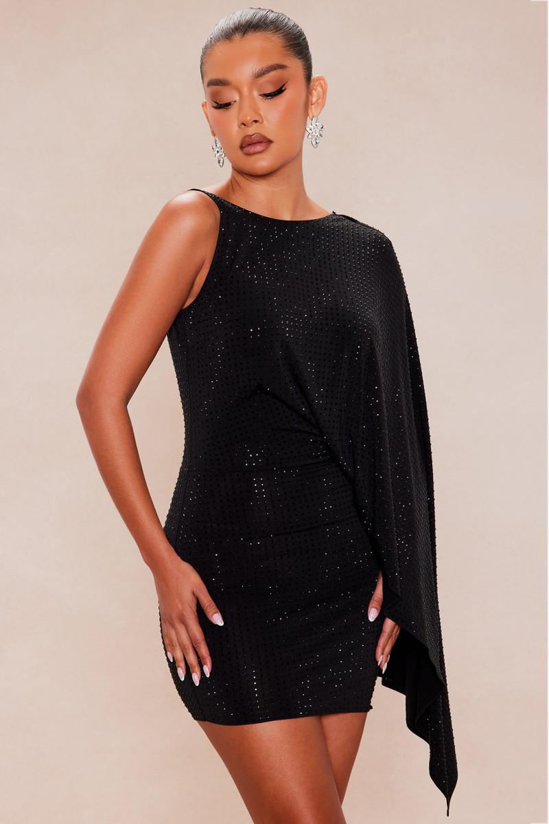 Ефектна міні-сукня з асиметричним вирізом на одне плече та драпірованим рукавом. Відкрита спина додає спокусливості, а прихована блискавка збоку забезпечує зручність. Сукня виконана з еластичної тканини, що ідеально підкреслює фігуру.