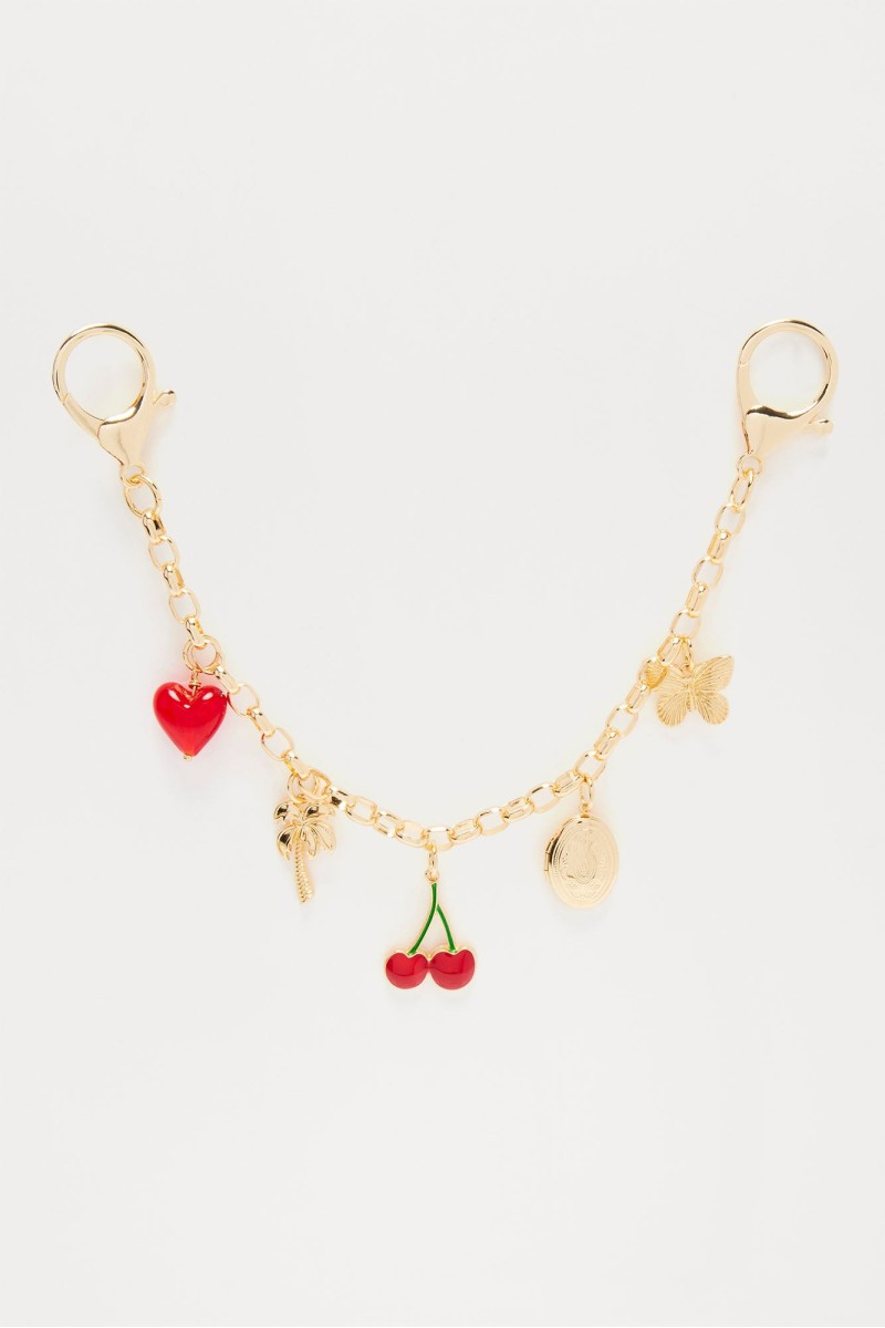 Чарівний аксесуар для вашої сумки у вигляді ланцюжка з підвісками. Прикрашений деталями у формі серця, вишеньки та метелика, що додасть вашому образу грайливості та індивідуальності. Імпортовано.