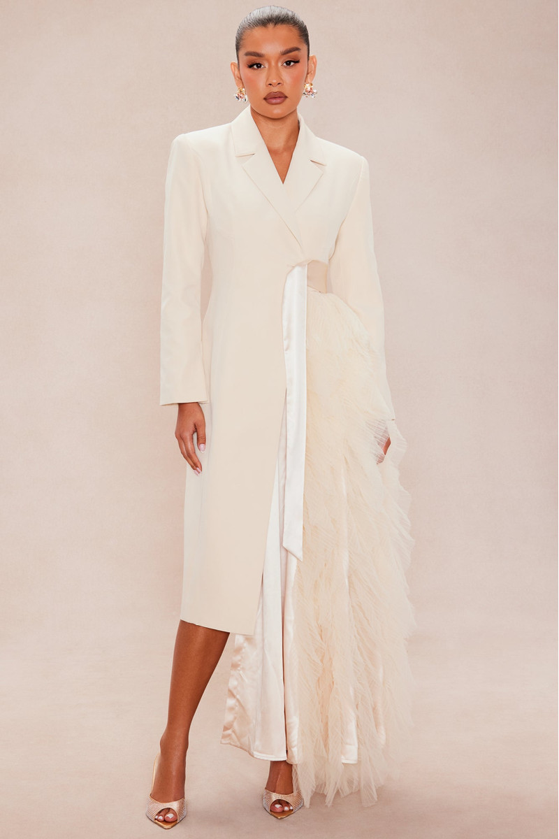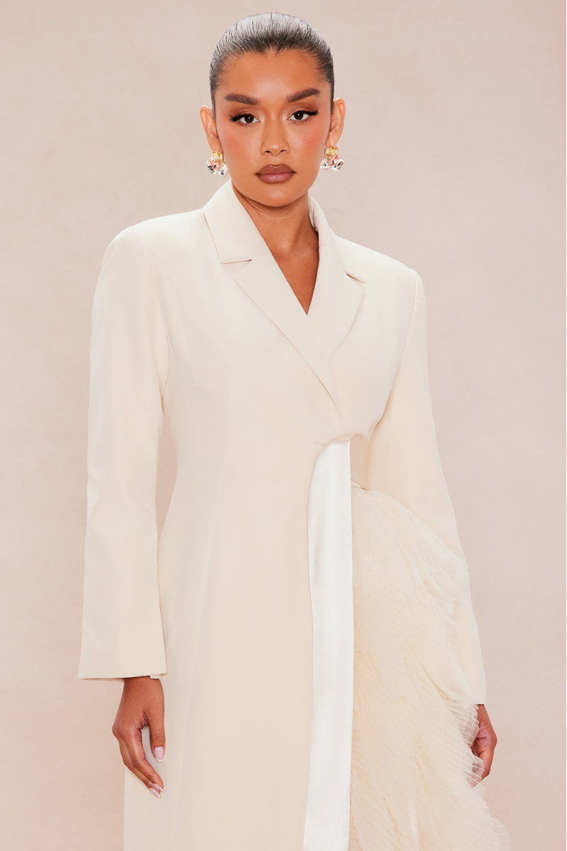 Сукня-блейзер максі довжини, виконана з ніжної тканини тюль. Класичний комір та елегантні довгі рукави додають вишуканості. Акцент на талії створюється за допомогою пояса, а деталі з рюшами надають образу легкості та грайливості. Підплічники забезпечують ідеальну посадку.