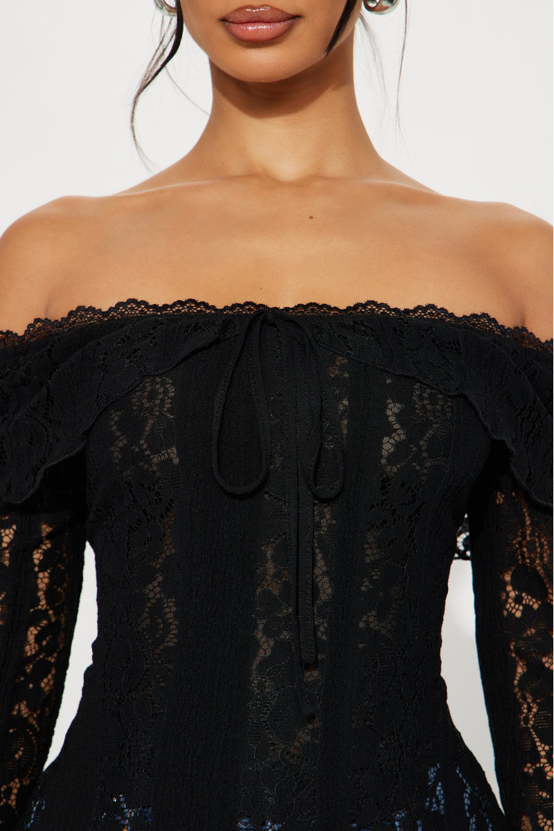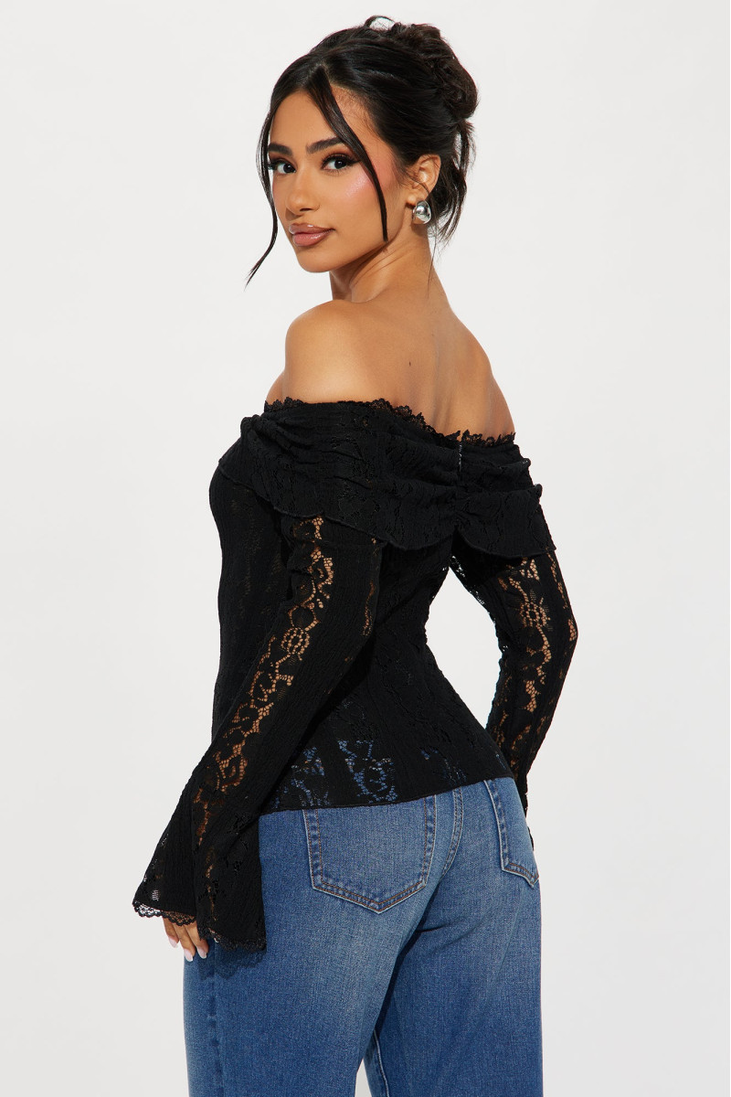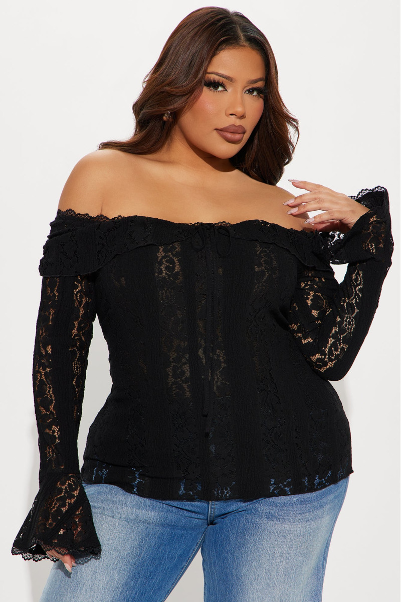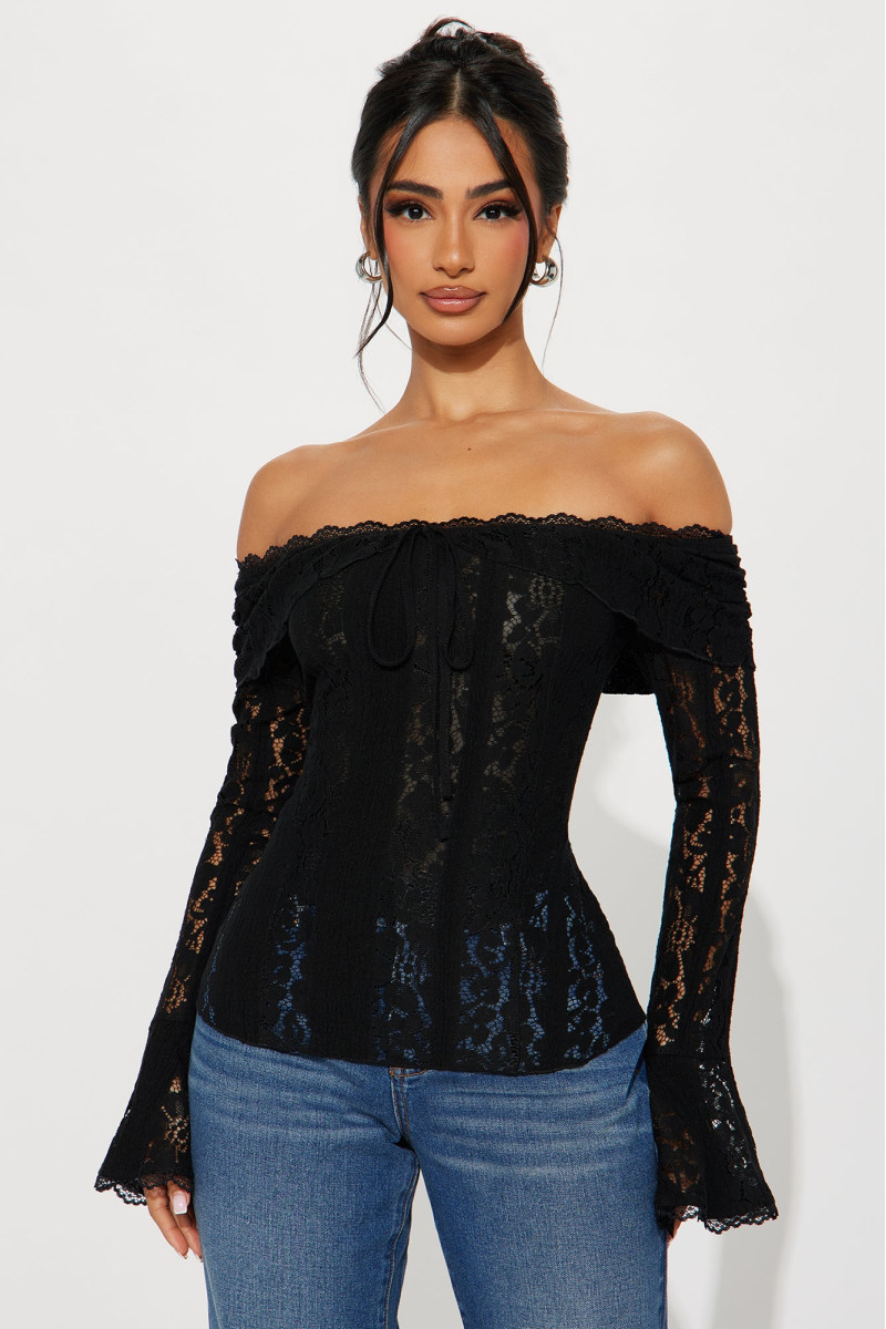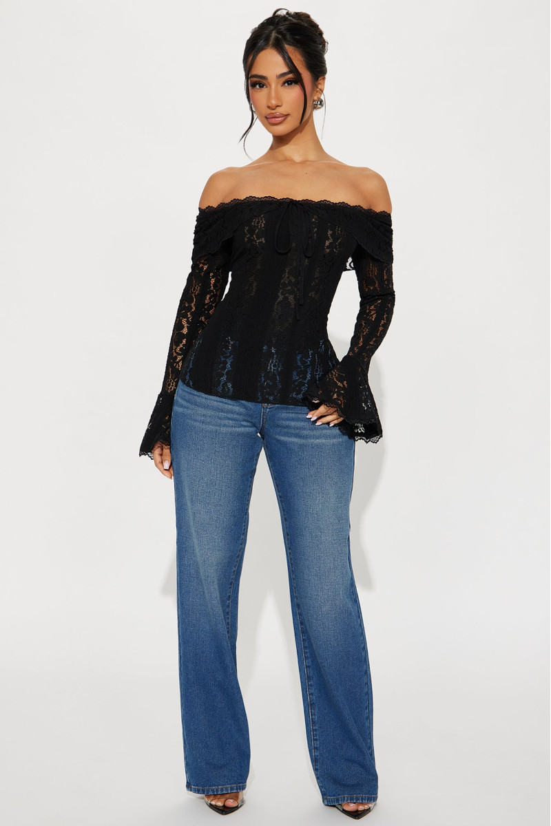 Чуттєвий топ з відкритою лінією плечей та довгими рукавами-дзвіночками, прикрашений вишуканим мереживом. Декоративна зав'язка спереду додає виробу особливої привабливості. Цей топ, виготовлений з використанням еластичних матеріалів, ідеально підкреслить вашу жіночність та стане яскравим акцентом вечірнього або святкового образу.