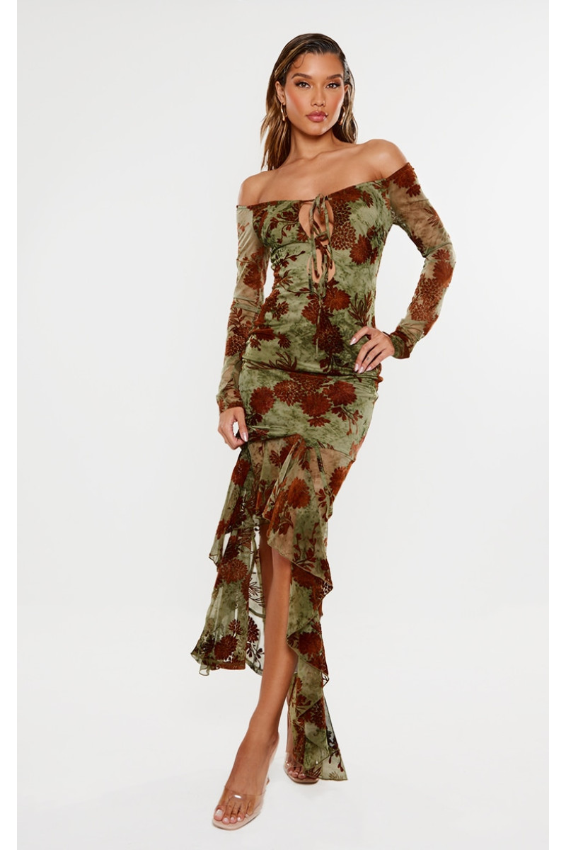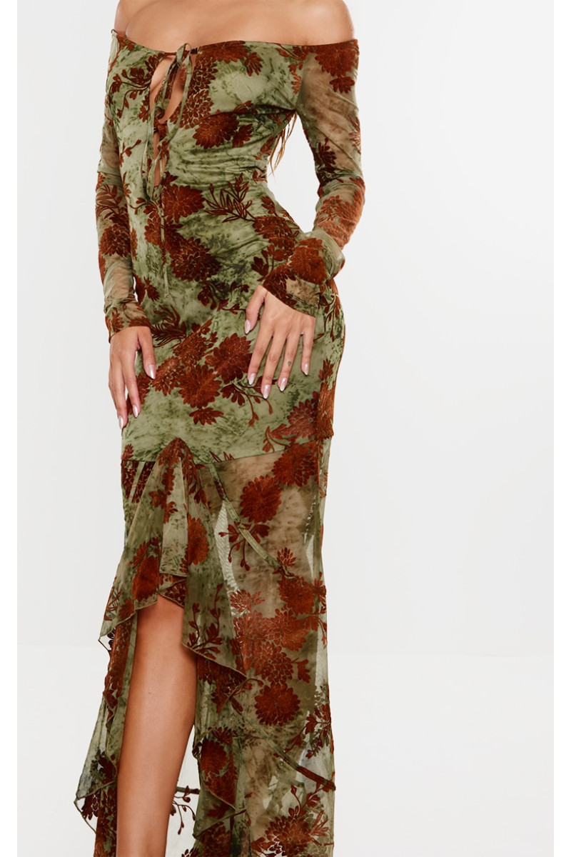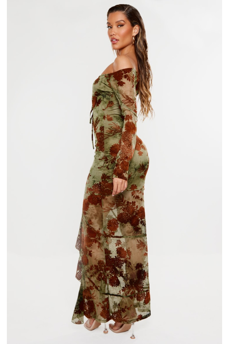 Щоб отримати позачасовий ефектний образ, який ми всі прагнемо, виберіть цю максі-сукню з довгим рукавом із зеленим квітковим принтом із відкритими плечима. Завдяки своєму зеленому відтінку, дизайну з квітковим принтом і матеріалом Devore це ідеальний аксесуар для наступного випадку. Стиль із прозорими підборами та ефектними сережками справді справляє враження. Довжина приблизно 145 см/57 дюймів (на основі розміру вибірки UK 8) На моделі одягнено розмір UK 8/ EU 36/ AUS 8/ US 4. Зріст моделі — 5 футів 9 дюймів. Наплечні рукави: Довгий випадок: вечір
