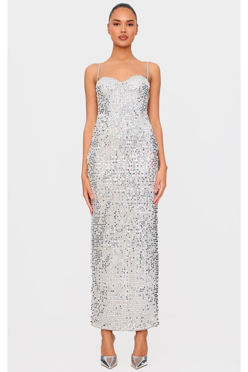 Зробіть свій образ кращим за допомогою цієї максі-сукні з корсетними деталями зі сріблястими блискітками. Представлений вам у сріблястому матеріалі з блискітками з ремінцями та деталлю корсета, ви обов’язково виділятиметеся серед інших. Додайте туфлі на підборах і улюблені аксесуари, щоб зробити образ ще кращим. Довжина приблизно 155 см/61 дюйм (на основі розміру вибірки UK 8) Модель одягнена в розмірі UK 8/ EU 36/ AUS 8/ US 4. Зріст моделі — 5 футів 9 дюймів Категорія: СукніТип продукту: Корсетна сукняКолір: СріблястийМатеріал: ПаєткиДекольте: МилаРукава: Спагетті : Вечір