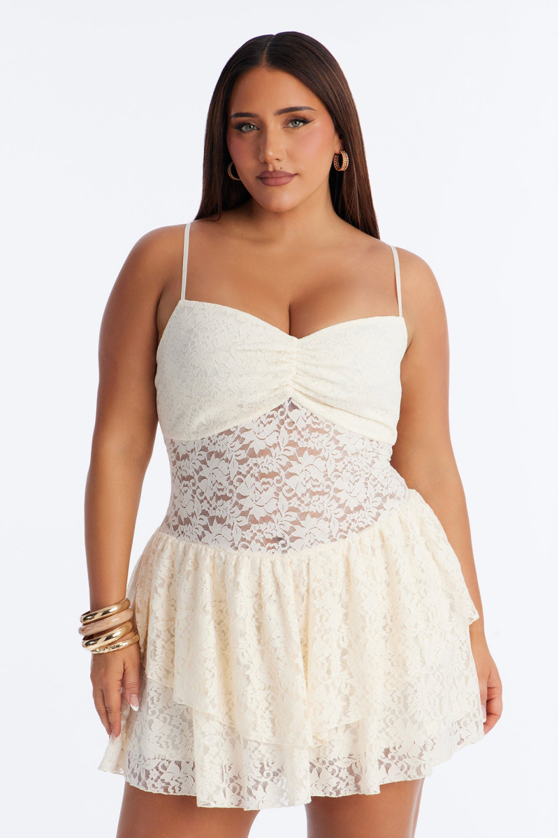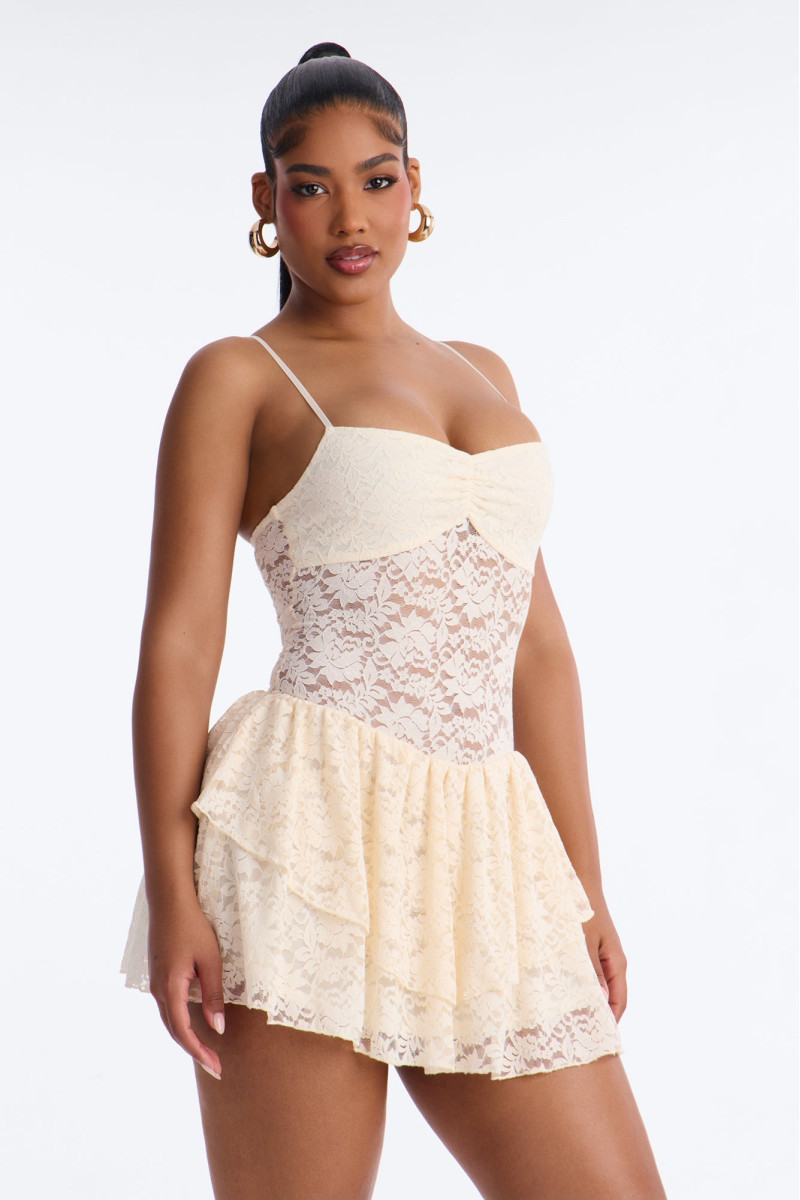 Чарівна міні-сукня "Сесилія" поєднує ніжне мереживо та грайливі рюші, створюючи романтичний та елегантний образ. Короткий силует підкреслює молодість та свіжість, а вишукані деталі роблять її особливою.
