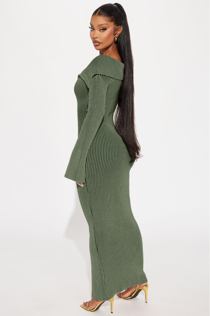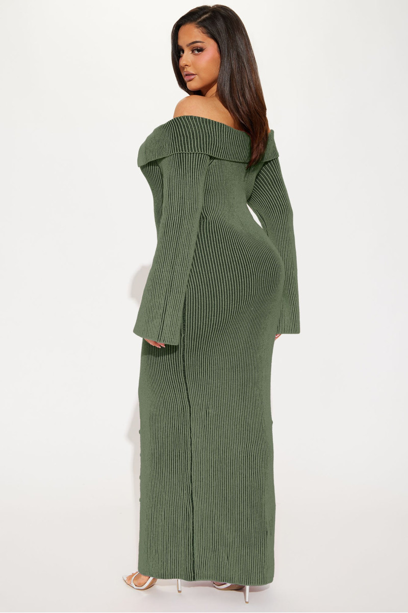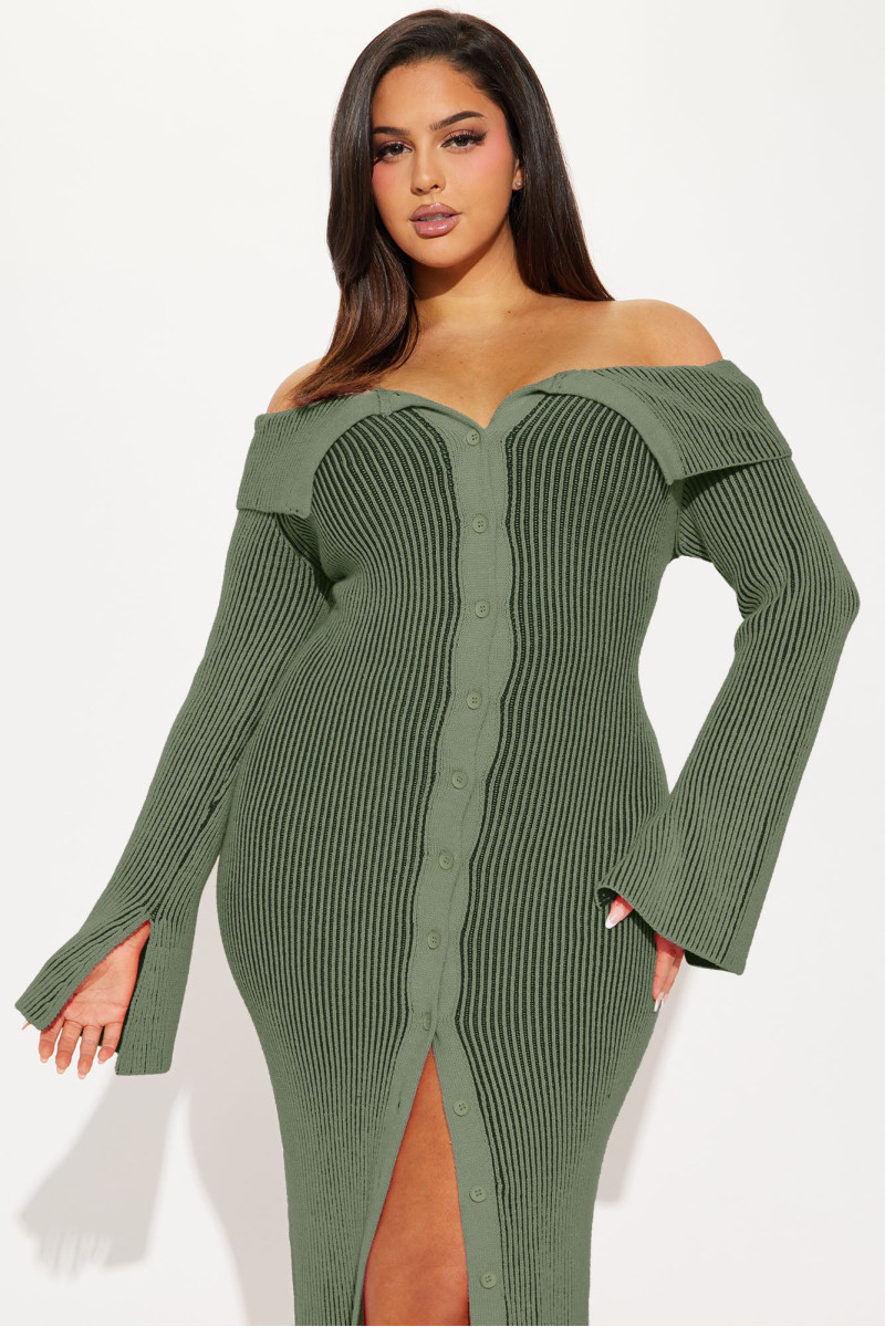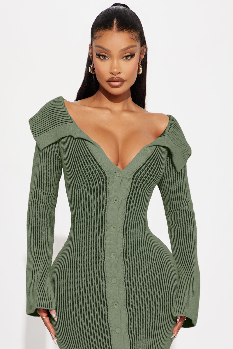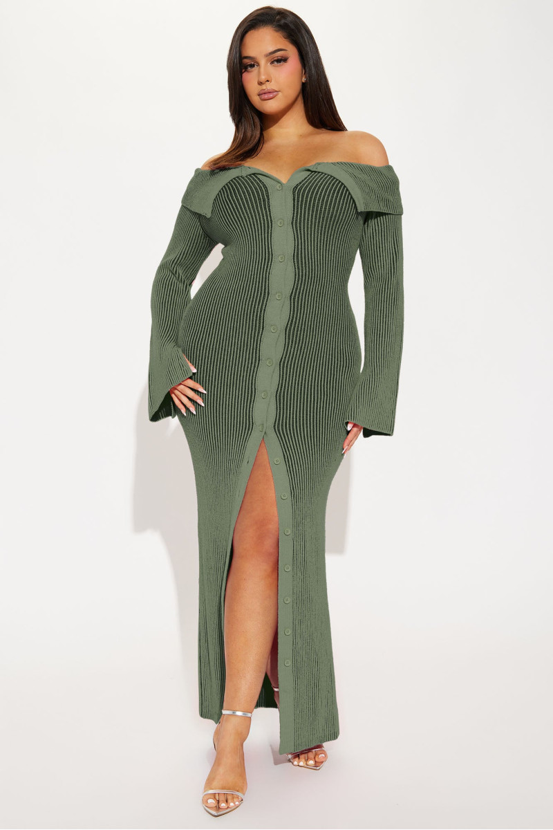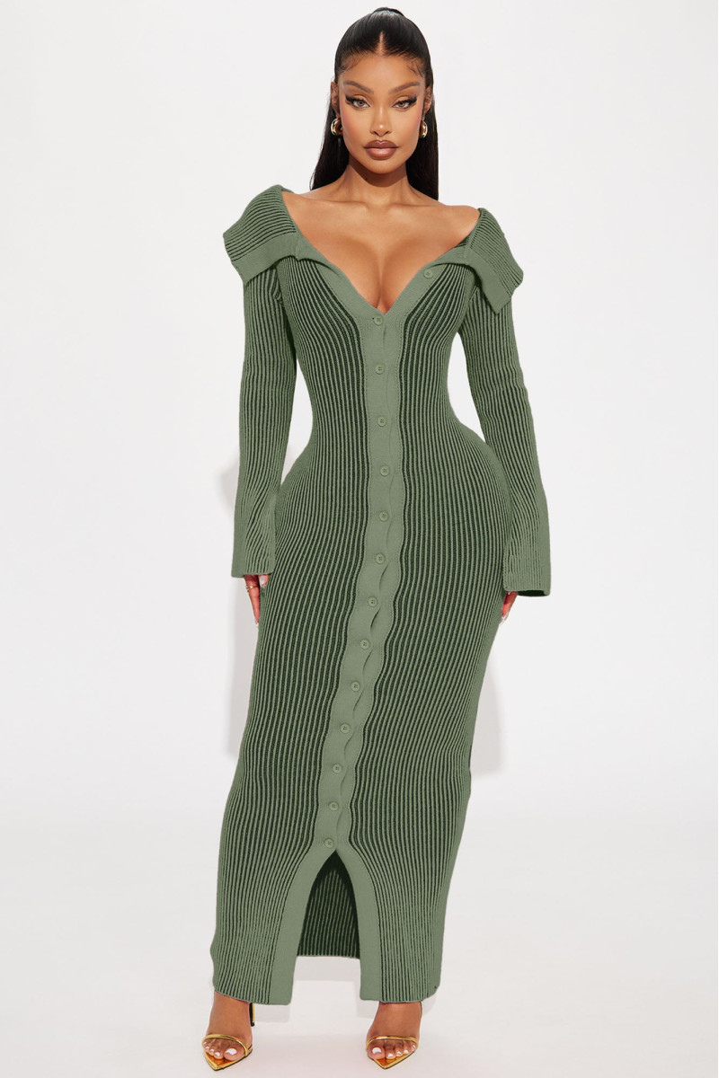 Затишна светр-сукня максі довжини з вишуканим дизайном «off-shoulder», що відкриває плечі. Довгі рукави та стильне ґудзикове застібання спереду роблять її універсальною. Виготовлена з м'якої та еластичної пряжі, ця сукня ідеально підходить для створення модних образів.